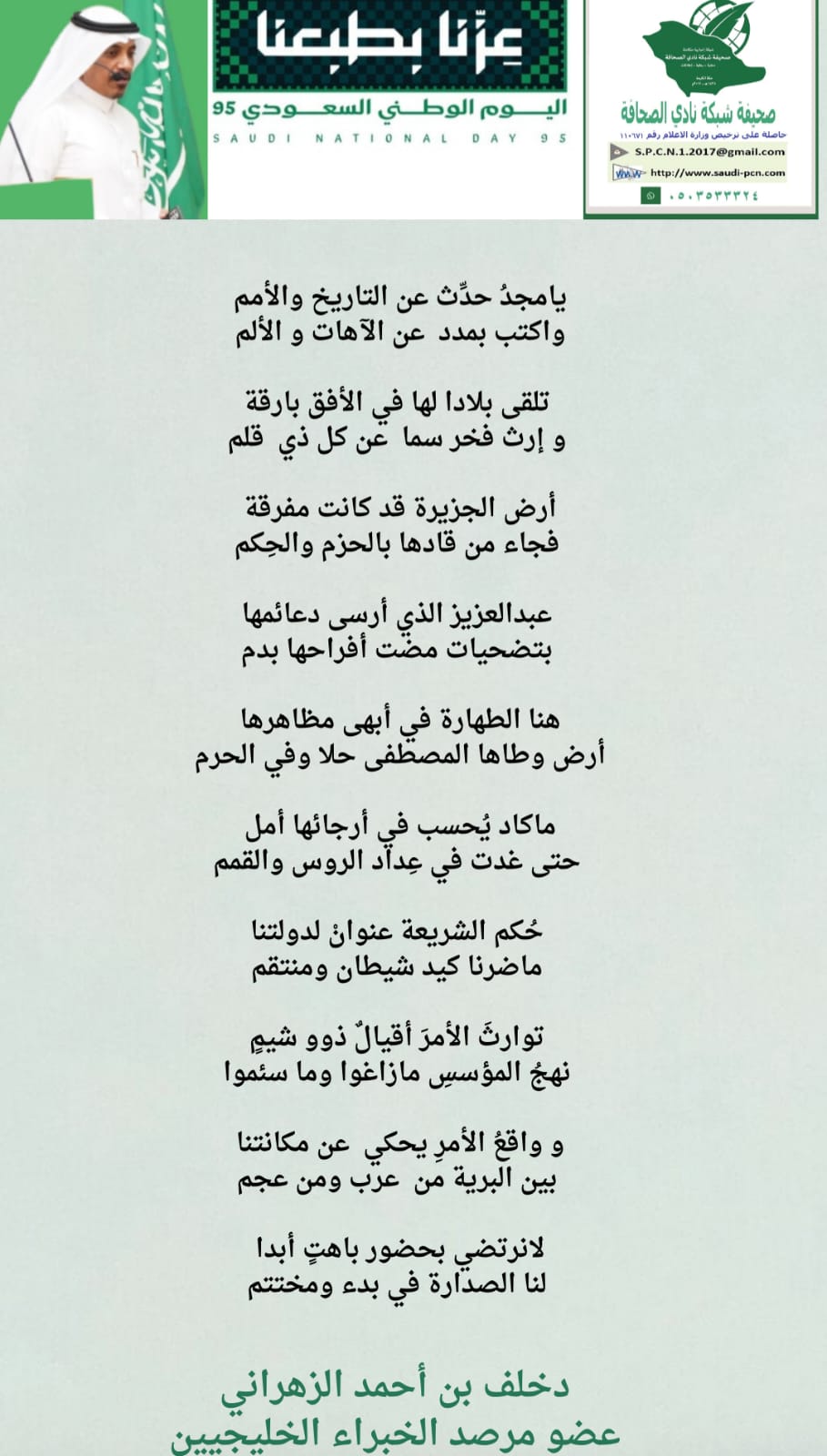 وكذلك كتب الشاعر د.خلف بن أحمد الزهراني عضو مرصد الخبراء الخليجيين قصيدة كانت كالتالي: