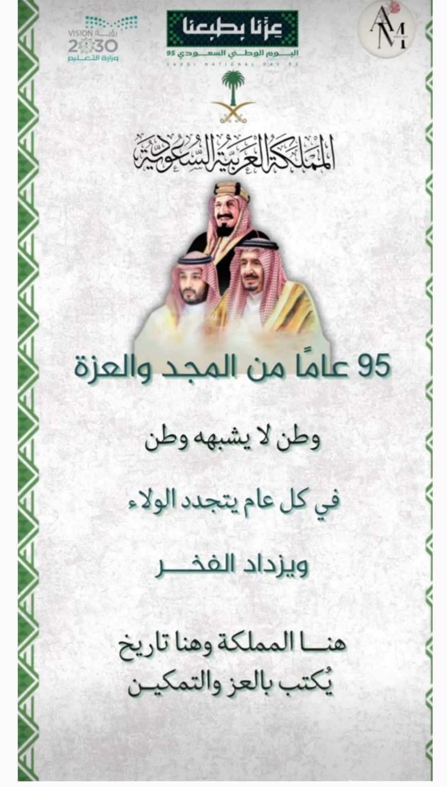 بمناسبه اليوم الوطني السعودي ال ٩٥ عزنا بطبعنا ، بكل فخر واعتزاز تحتفل المملكة العربية السعودية قيادة وشعبا باليوم الوطني الخامس والتسعين ذكرى توحيد البلاد على يد المؤسس الملك عبدالعزيز بن عبدالرحمن ٱل سعود -طيب الله ثراه- الذي أرسى قواعد وطنا عظيم ، وجمع الشتات تحت راية واحدة لتبدأ بذلك مسيرة دولة حديثة تنمو على قيم العقيدة ، وتزدهر برؤية القيادة وتسمو بعزيمة أبناءها.