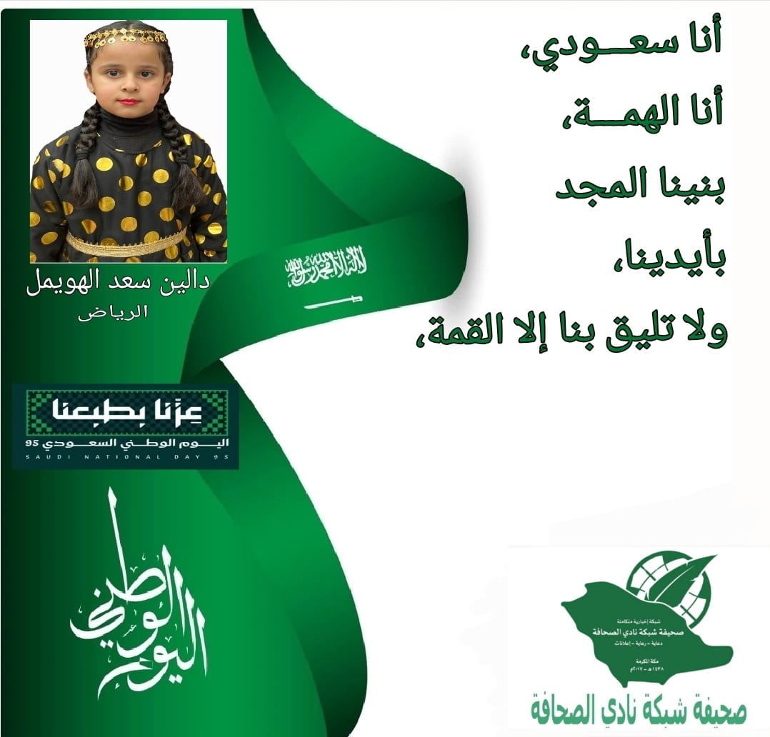 اليوم الوطني السعودي يوم فخر واعتزاز ، مناسبة خالدة تجسد وحدة وطن وقوة شعب ، يجمع الماضي بالحاضر ، ويغرس الأمل في مستقبل مزدهر تحت راية التوحيد ،